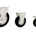 Колеса с литой резиновой шинкой широко применяются внутри помещений с грубыми полами, на складах, заводах и т.д. Их можно использовать на неровных поверхностях с препятствиями, во влажной окружающей среде при наличии средних по активности химических веществ, а также вне помещений. Колеса с литой резиновой шинкой черного цвета имеют стальной оцинкованный обод, в оси колес роликовый подшипник. Кронштейны изготовлены прессованием из листовой стали. Крепление — платформенная площадка под четыре болта. В поворотном узле двухрядный шарикоподшипник, верхний ряд шариков защищен пластиковым кольцом пыльника. Позади идущая тормозная система фиксирует поворот колеса и поворотный узел. Рабочая температура от -25°С до +50°С