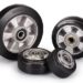 Колеса усиленная промышленно-большегрузная с литой резиновой шинкой широко применяются внутри помещений с грубыми полами, на складах, заводах и т.д. Их можно использовать на неровных поверхностях с препятствиями, во влажной окружающей среде при наличии средних по активности химических веществ, а также вне помещений. Колеса с литой резиновой шинкой черного цвета имеют литой алюминовый диск, в оси колес шариковый подшипник. Кронштейны изготовлены прессованием из листовой стали. Крепление — платформенная площадка под четыре болта. В поворотном узле двухрядный шарикоподшипник, верхний ряд шариков защищен пластиковым кольцом пыльника. Позади идущая тормозная система фиксирует поворот колеса и поворотный узел. Рабочая температура от -25°С до +50°С